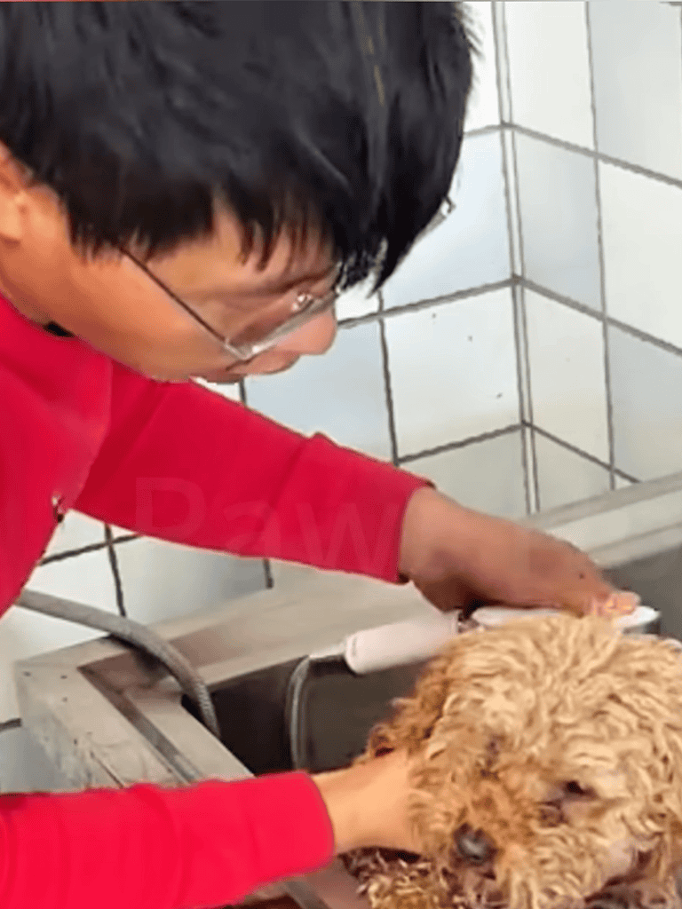 As I rinsed the soap, the dog tensed, ears flattening at the water. She scrambled to flee, her movements driven by instinct. Despite her fear, her gaze held trust. I gently reassured her, determined to help her through.
