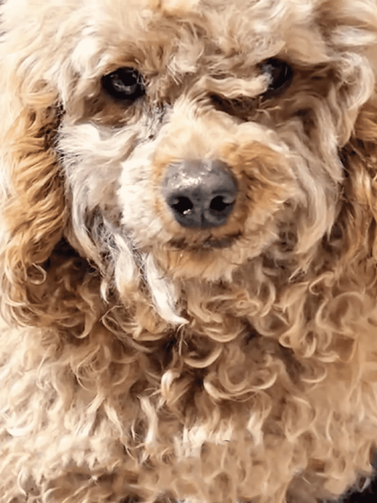 She stays calm by my side, even with other dogs barking, as if she knows she’s found where she belongs.