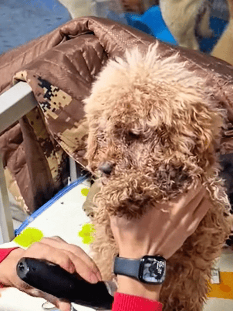 I used a smaller hair dryer to carefully dry the timid dog’s fur. Her eyes watched as I worked gently, the soft hum keeping her calm. She stood still as I dried her, her fur fluffing up and her demeanor relaxing.