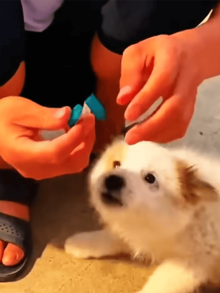 Sunny remained calm and cooperative during deworming, sitting quietly as if understanding it would help.
