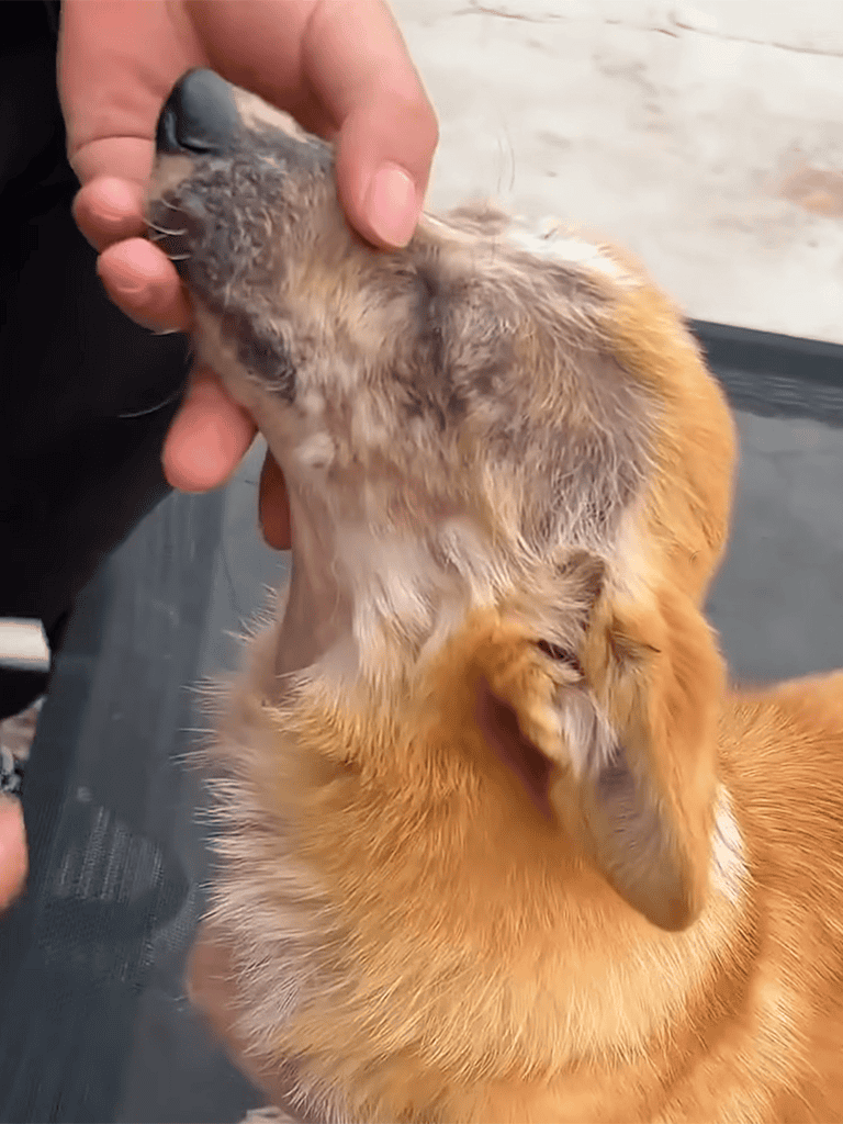 The vet gave an injection and sprayed medicine on Biscuit’s inflamed skin to curb the infection. It wasn’t a complete solution, but a start. Biscuit barely flinched—too weak or sensing help. The rescuers watched, hearts aching at her fragility. Her healing would take time, but they were determined.