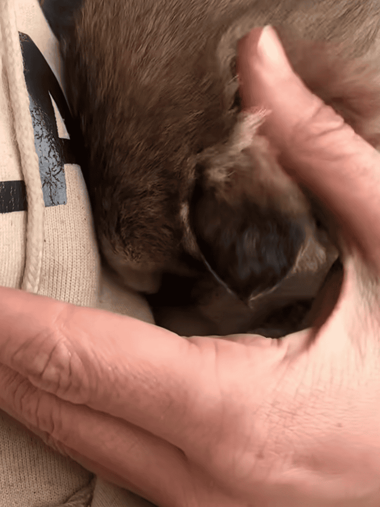 She knelt, extended a hand, and scooped it up. The dog whimpered but soon relaxed.