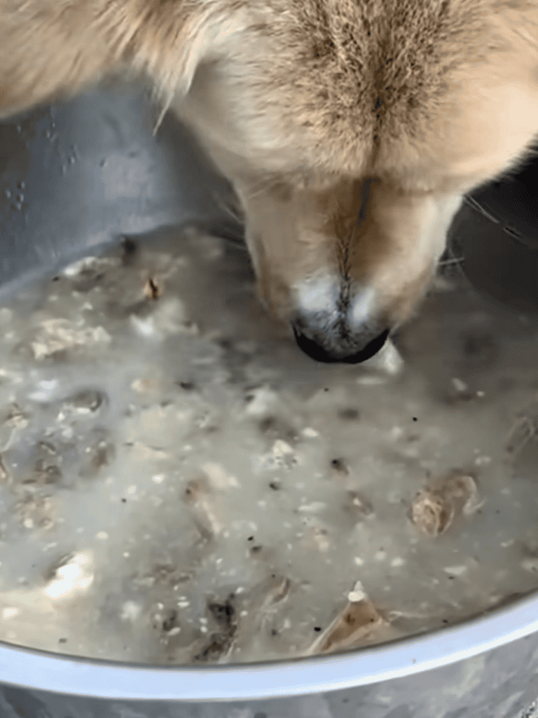 The owner prepared a warm bowl of lamb soup to help the mother dog recover.