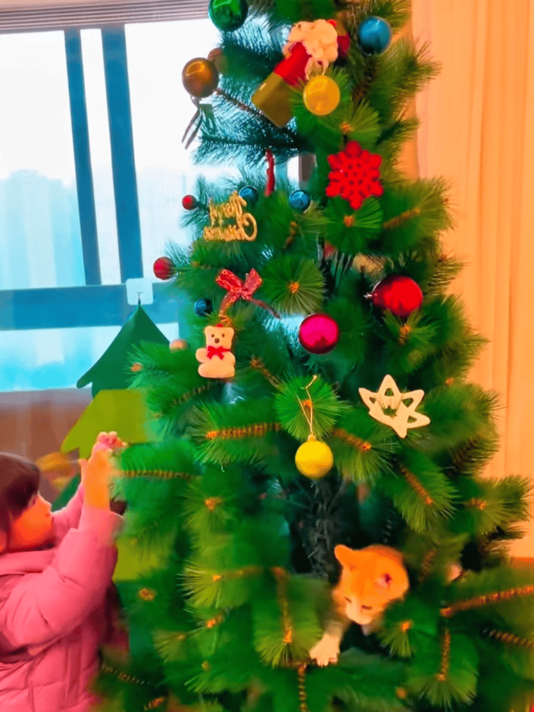 On Naer’s first Christmas, he eagerly joined as we decorated the tree, batting at ornaments with curiosity.