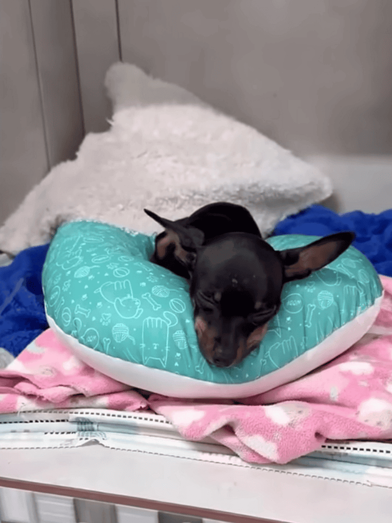 The fragile dog lay battered, suffering from severe head trauma, a crooked neck, and ailments like hypoglycemia and hypothermia.